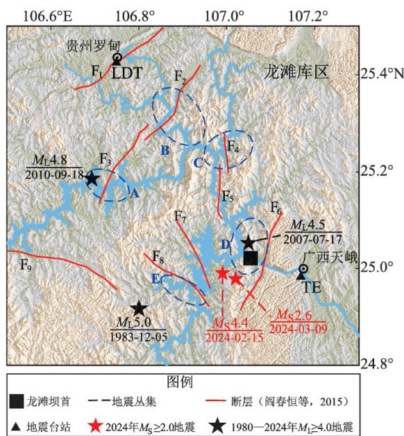 摘要:蓄水及库岸不稳定等因素可能导致水库库区及周边地震活动的增强,甚至诱发破坏性地震。2024年2月15日广西天峨县发生 Ms4.4 地震,震中距离大型水利枢纽龙滩水库不到 10km ,为近10年内该水库区域记录到的最大震级地震。为了分析该地震的发震机理,使用Nonlinloc非线性定位方法重新测定了该地震的震中位置,通过CAP方法拟合近震波形,反演了震源机制解和矩心深度。最后结合Rayleigh 面波振幅谱和 sPL近震深度震相,进一步确认该地震的矩心深度。结果显示:天峨 Ms4.4 地震位于水库坝首地震丛,震源机制显示为走滑型,地震矩心深度约为 3km ,推测其发震断层可能为龙凤一八腊断裂。