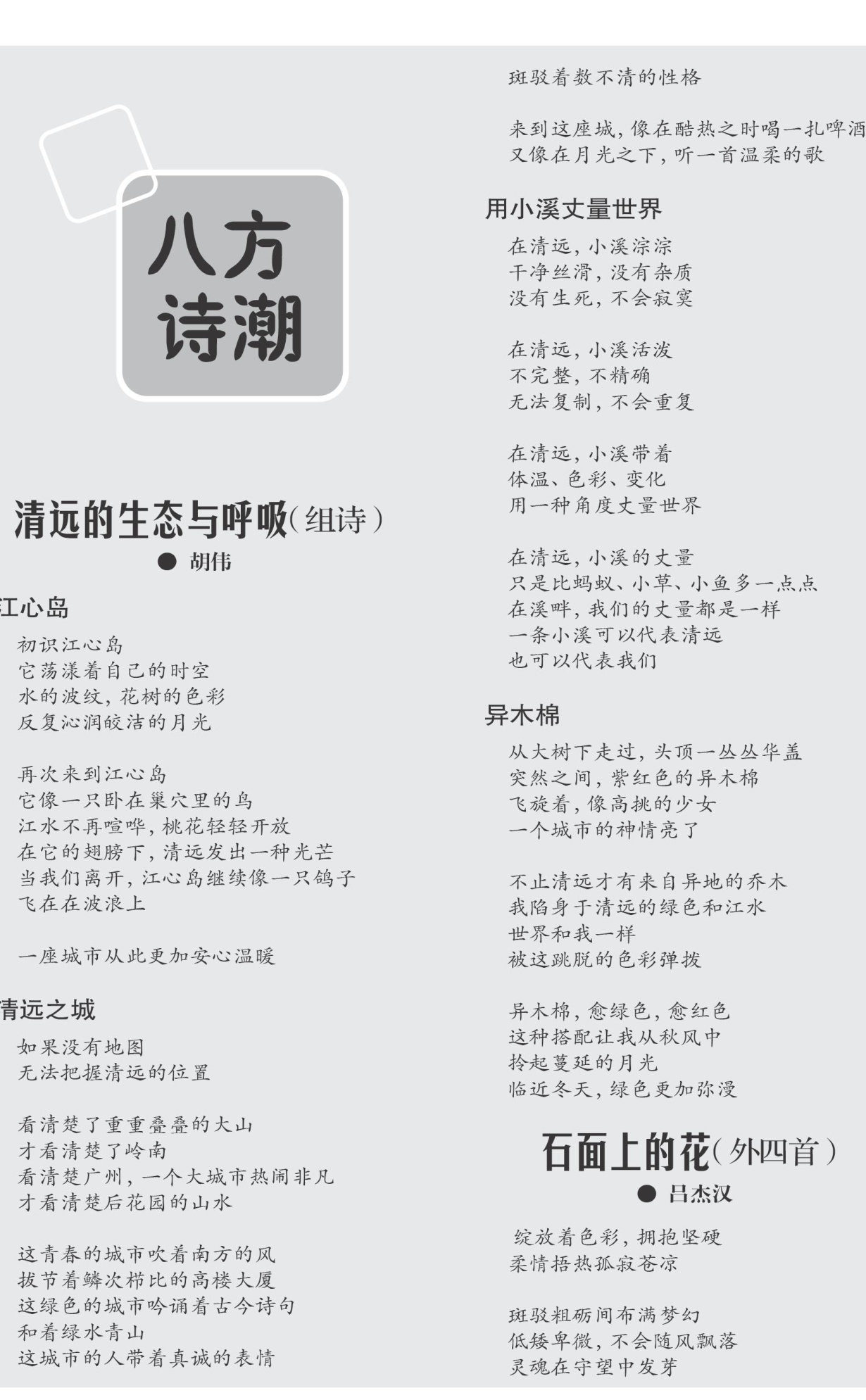 清远的生态与呼吸 (组诗) 胡伟 江心岛 初识江心岛 它荡漾着自己的时空 水的波纹,花树的色彩 反复沁润皎洁的月光 再次来到江心岛 它像一只卧在巢穴里的鸟 江水不再喧哗,桃花轻轻开放 在它的翅膀下,清远发出一种光芒 当我们离开,江心岛继续像一只鸽子 飞在在波浪上 一座城市从此更加安心温暖 清远之城 如果没有地图 无法把握清远的位置 看清楚了重重叠叠的大山 才看清