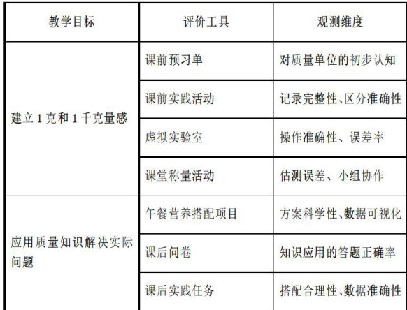 【摘要】在小学数学教学中,传统评价模式亟待革新,以适应核心素养的培养。本文以人教版二年级下册《克和千克》单元为例,依据新课标“教—学—评”一致性理念,深入分析教学内容,开发诊断性、过程性和总结性评价工具,通过课前、课中、课后等阶段评价,全面评估学生在量感、应用意识等维度的发展。研究显示,素养导向的评价工具能促进教学与评价的融合,提升学生的数学核心素养,为教学评价改革提供实践范例和经验。