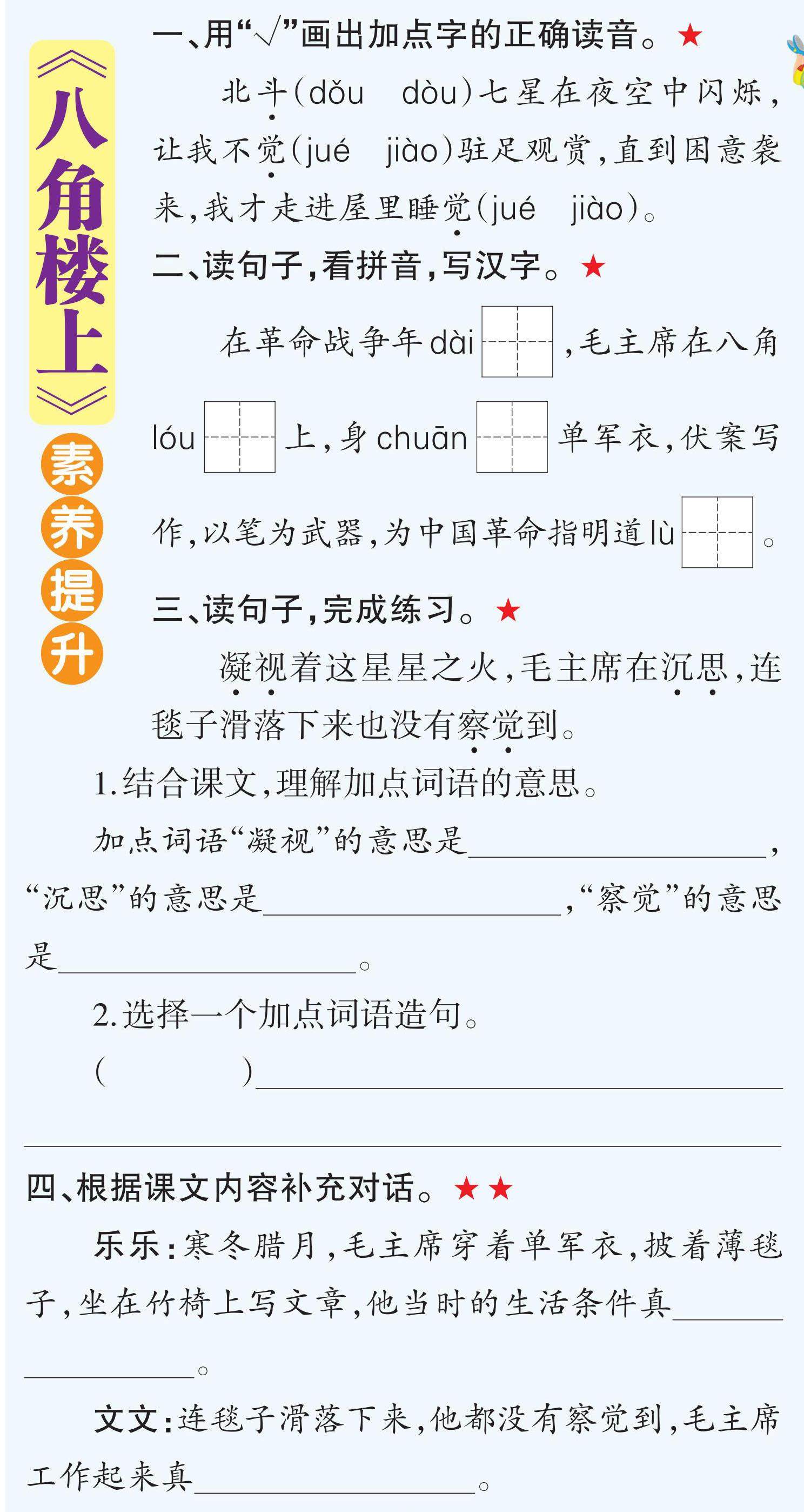 一、用“√”画出加点字的正确读音。★ 北斗(dǒu dòu)七星在夜空中闪烁,让我不觉(jué jiào)驻足观赏,直到困意袭来,我才走进屋里睡觉(jué jiào)。 二、读句子,看拼音,写汉字。★ 在革命战争年dài[][ ],毛主席在八角lóu[][ ]上,身chuān[][ ]单军衣,伏案写作,以笔为武器,为中国革命指明道lù[][ ]。 三、读句子,完成练习。★ 凝视着这星星之