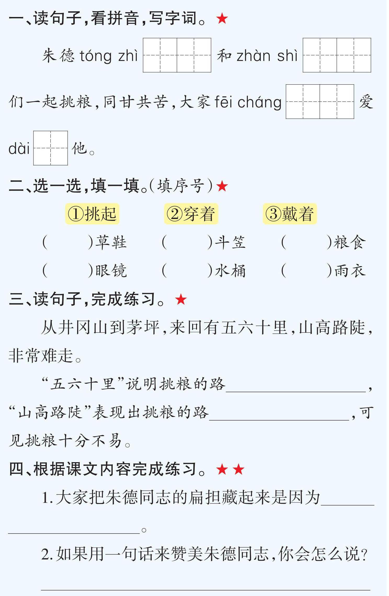 一、读句子,看拼音,写字词。★ 朱德tóng zhì[][ ][ ]和zhàn shì[][ ][ ]们一起挑粮,同甘共苦,大家fēi cháng[][ ][ ]爱dài[][ ]他。 二、选一选,填一填。(填序号)★ ①挑起 ②穿着 ③戴着 ( )草鞋 ( )斗笠 ( )粮食 ( )眼镜 ( )水桶 ( )雨衣