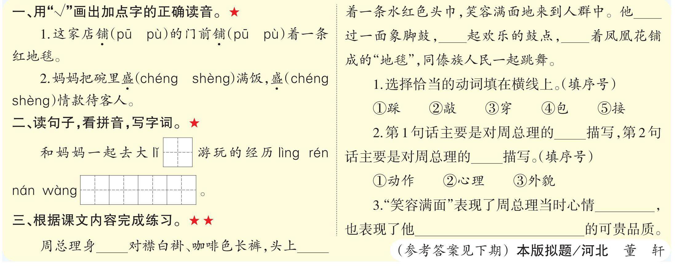一、用“√”画出加点字的正确读音。★ 1.这家店铺(pū pù)的门前铺(pū pù)着一条红地毯。 2.妈妈把碗里盛(chéng shèng)满饭,盛(chéng shèng)情款待客人。 二、读句子,看拼音,写字词。★ 和妈妈一起去大lǐ[][ ]游玩的经历lìng rén nán wàng[][ ][ ][ ][ ]。 三、根据课文内容完成练习。★★ 周总理身