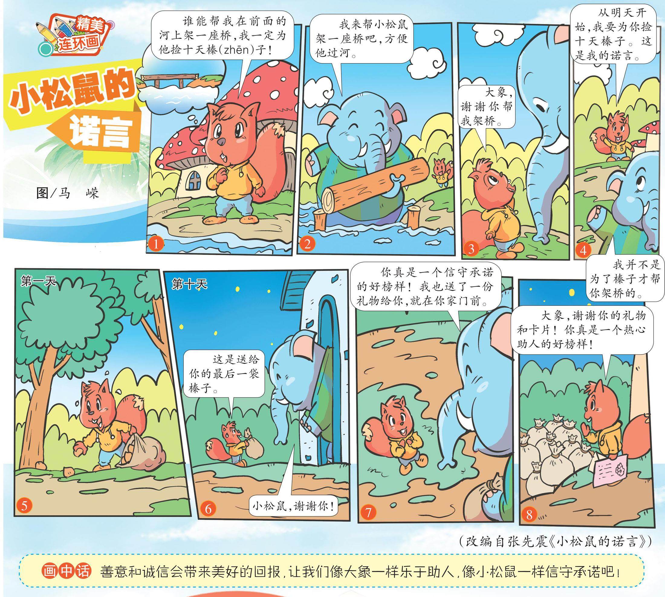 谁能帮我在前面的河上架一座桥,我一定为他捡十天榛(zhēn)子! 画中话 善意和诚信会带来美好的回报,让我们像大象一样乐于助人,像小松鼠一样信守承诺吧!